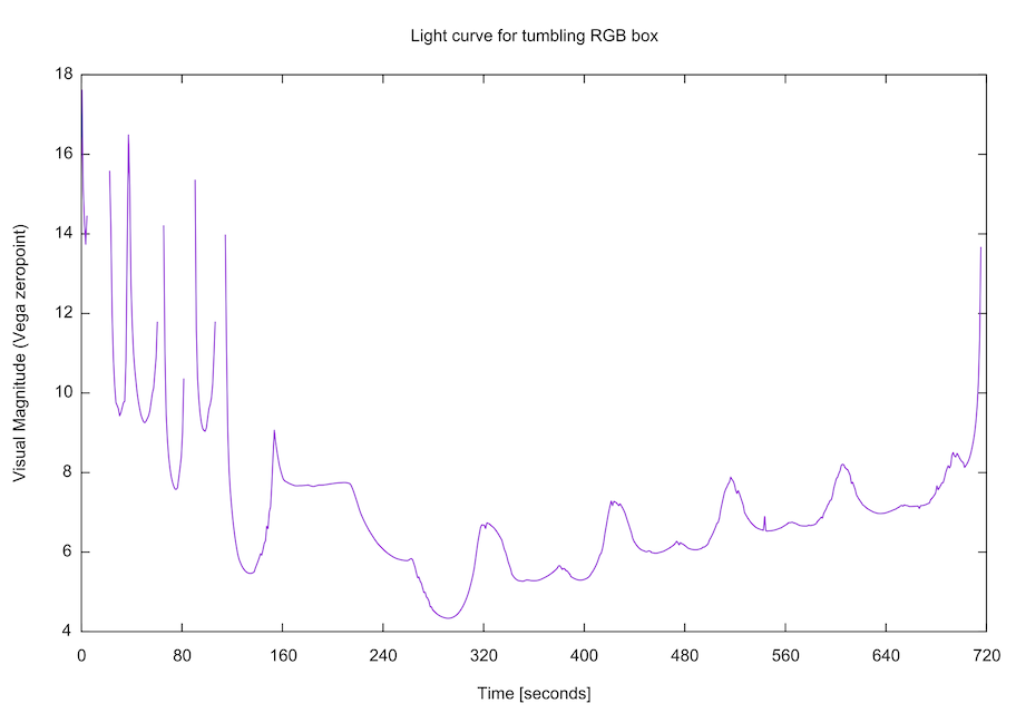 A horizon to horizon light curve for a tumbling RGB box in orbit observed from the ground.